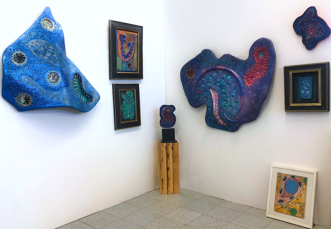 Die Assemblages bestehen aus verformten Materialien wie Hartfaserplatten, kombiniert mit Naturfundstücken, Stoffen und kleinen Applikationen. In alten Rahmen oder auf Sockeln inszeniert, regen sie zur Interpretation an – bleiben jedoch geheimnisvoll und rätselhaft.